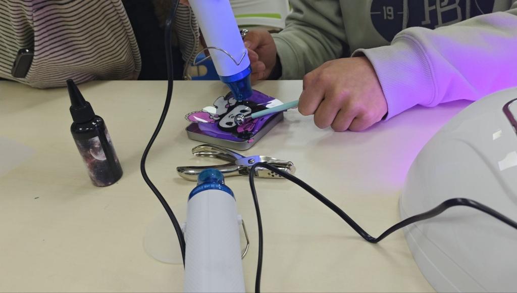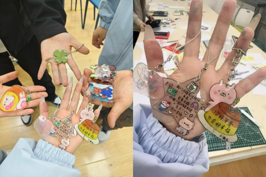 绘制完成后,同学们共同见证热缩片遇热收缩的奇妙过程,再通过UV胶封层、烤灯固化等工序,将平面画作变成独一无二的钥匙扣、挂饰。从设计、绘制到成品,大家在协作中交流技巧,在分享中收获喜悦,当亲手制作的创意挂件成型时,脸上洋溢着满满的成就感,纷纷合影留念,定格这份专属春日的青春回忆。