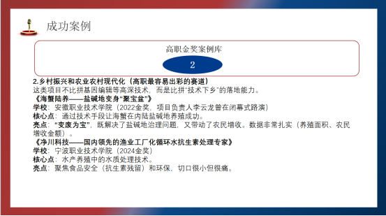 针对成功案例与产业融合,张老师通过剖析往届国赛、省赛的金奖项目,重点展示了如何将专业建设、企业需求与竞赛项目有机结合。优秀的创业计划书应当扎根产业一线,解决行业痛点,真正实现“以赛促教、以赛促学、产教融合”。